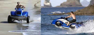 Gibbs Technologies , Quadski-гидроцикл, "гидро-квадроцикл" оснастили бензиновым 140-сильным мотором, а также мощным водометным двигателем, предназначенным для движения по воде. Переход с твердой почвы на водную гладь у Quadski занимает всего пять секунд, а его колеса при этом убираются в специальные ниши в верхней части кузова. На грунте он может разогнаться до 130 км в час, а по воде - до 72 км в час. Запас хода составляет почти 600 километров. Стоимость составит 46 тысяч долларов.